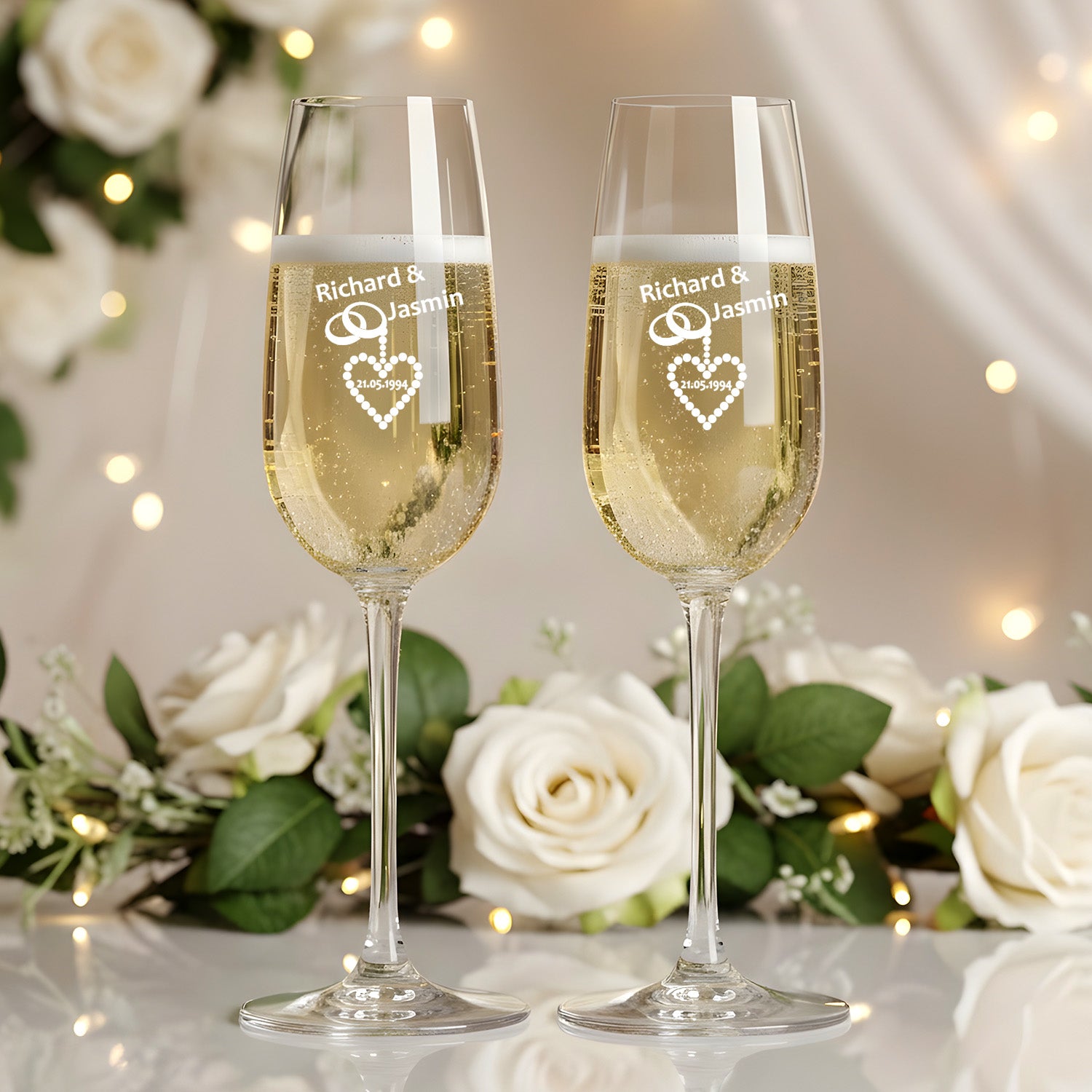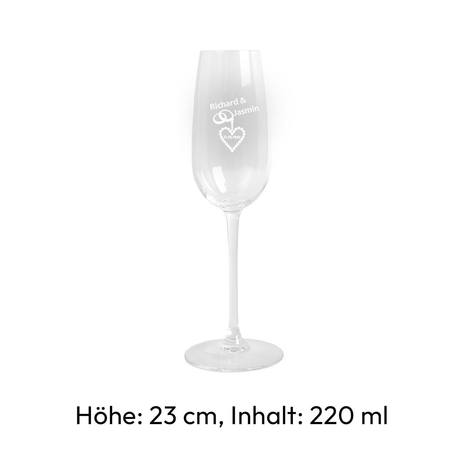 Die Gläser werden mit einem wunderschönen Gravurmotiv versehen: Zwei Ringe, an denen ein Herz hängt – und genau in dieses Herz wird Dein gewünschtes Datum eingraviert. Neben den Ringen verewigen wir die beiden Wunschnamen, sodass dieses Set die Liebe und Verbundenheit des Paares perfekt widerspiegelt.
