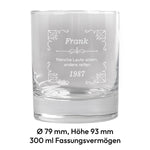 Unser Whiskyglas - Ornament mit Personalisierung ist nicht nur ein gewöhnliches Glas. Es ist ein Statement - ein Ausdruck von Liebe und Leidenschaft für feinen Whisky. Es zeigt, dass man ein Kenner ist, der die Kunst des Genießens beherrscht. Die gravierten Details auf dem Glas machen es zu einem wahren Kunstwerk, das in jeder Bar oder Sammlung einen Ehrenplatz verdient hat.