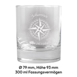 Das Whiskyglas ist 8,8 cm hoch und besitzt einen Durchmesser von 8 cm. Als besonderes Highlight verewigen wir das Motiv eines Kompasses auf dem Glas. Für die persönliche Gravur stehen Dir drei verschiedene Möglichkeiten zur Auswahl: Wahlweise verewigen wir einen Wunschnamen und ein Datum Deiner Wahl; zwei Wunschnamen oder zwei Wunschnamen und die Koordinaten eines für dich bedeutsamen Ortes. Gib uns für die letzte Variante einfach die Adresse des Ortes (Ort mit PLZ., Straße und ggf. Hausnummer).