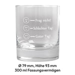 Das elegante Whiskyglas hat ein Fassungsvermögen von etwa 320 ml und zeichnet sich durch seine Qualität und hochwertige Verarbeitung aus. Es ist mit drei Füllbegrenzungen gekennzeichnet, an denen der Stressgehalt des Tages gemessen wird. Die Markierungen „Frag nicht!“, „Schlechter Tag!“ und „Guter Tag!“ werden um drei witzige Smileys ergänzt, die die Stimmung der Ausrufe widerspiegeln.