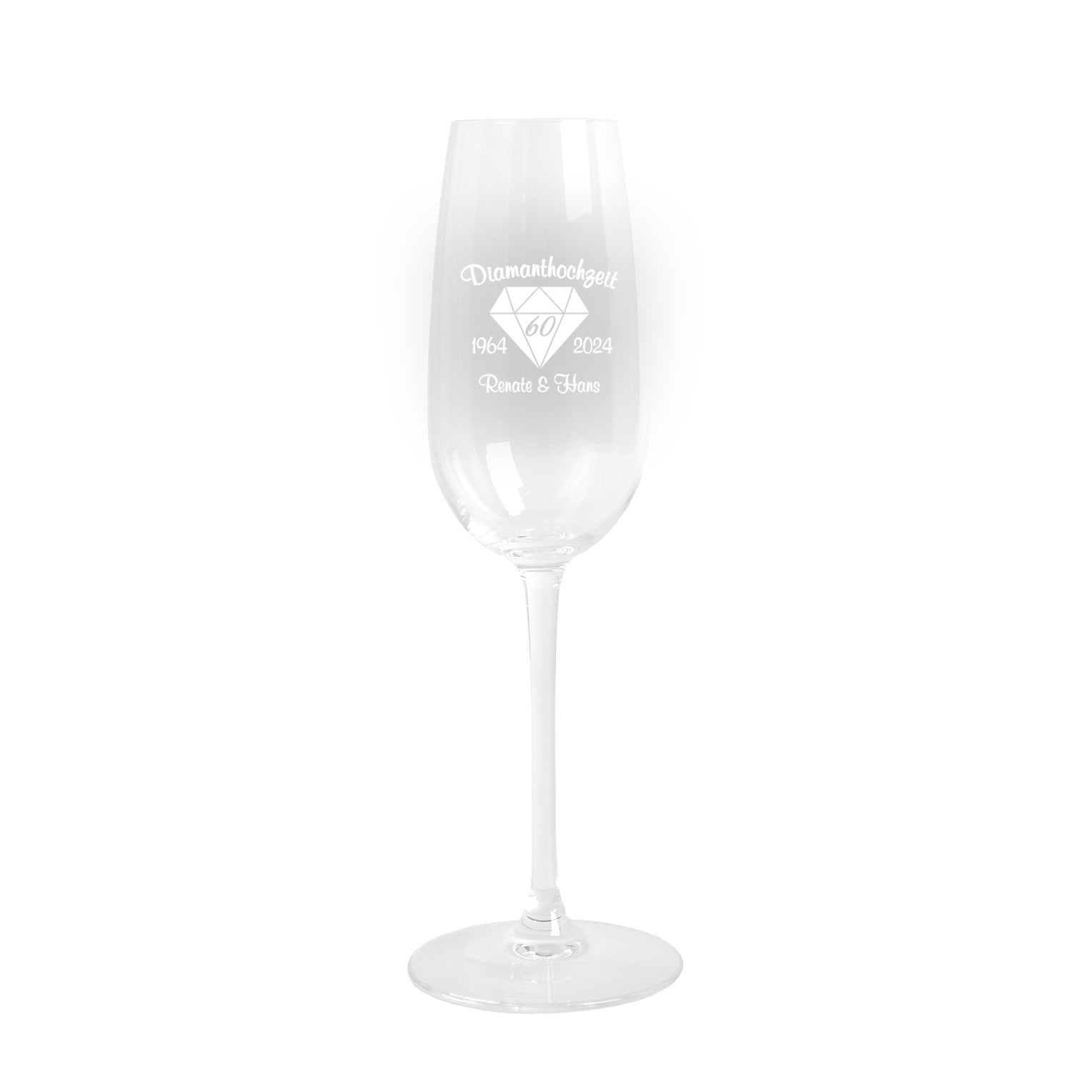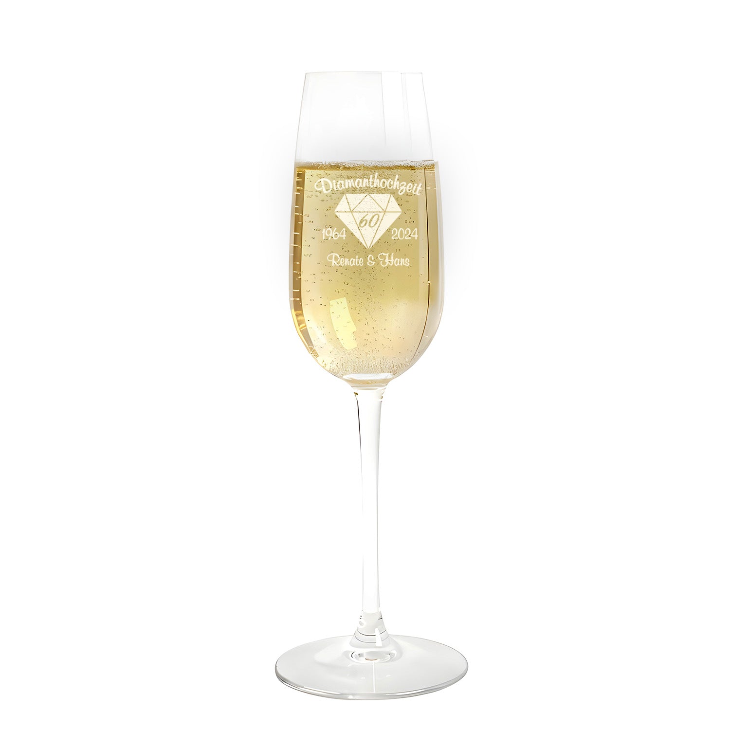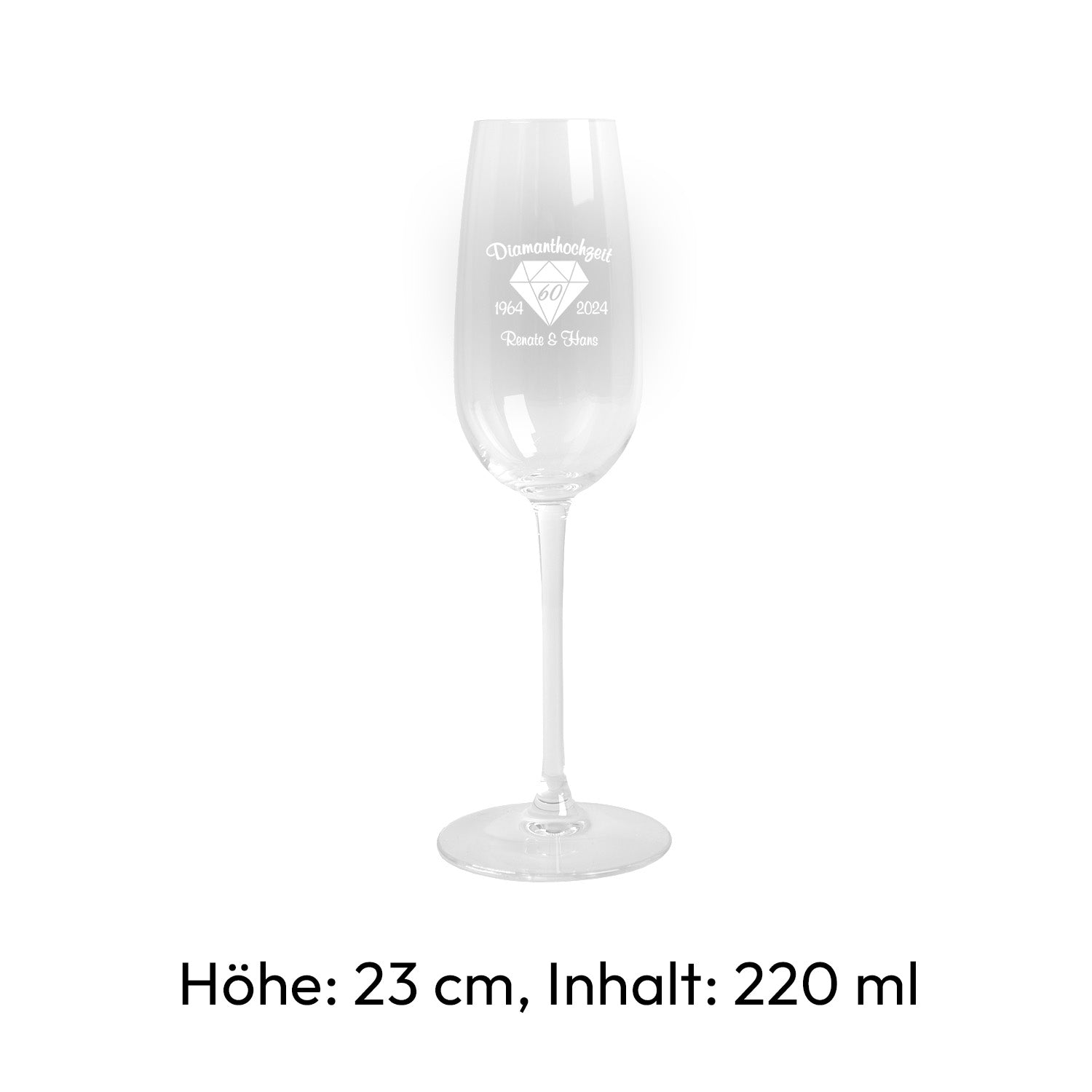 Das Set besteht aus zwei hochwertigen Sektgläsern . Jedes Sektglas verfügt über ein Fassungsvermögen von 220 ml und zeichnet sich durch sein zeitloses Design aus. Passend zum Jubiläum werden die Gläser mittels hochwertiger Lasergravur mit einem Diamanten, der Zahl 60 sowie dem Schriftzug "Diamanthochzeit" graviert. Überrasche das Paar mit einem echten Unikat, denn jedes Glas wird zudem mit den Namen des Paares, dem Jahr der Eheschließung und dem Jubiläumsjahr graviert. Ein wundervolles Geschenkset, mit dem Du Freunden oder Familie eine besondere Freude machen wirst.